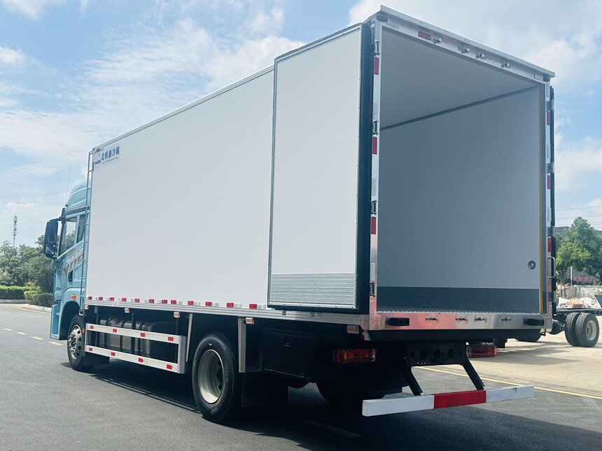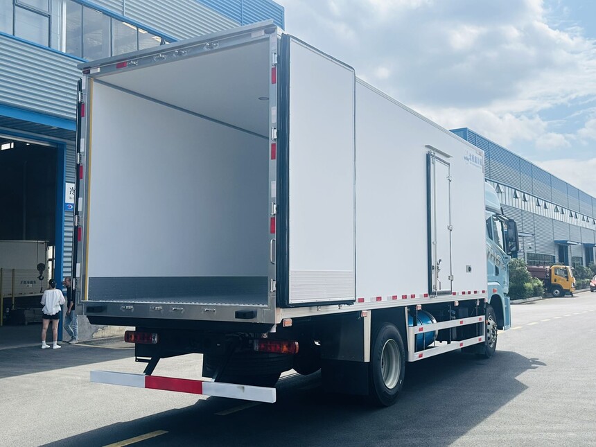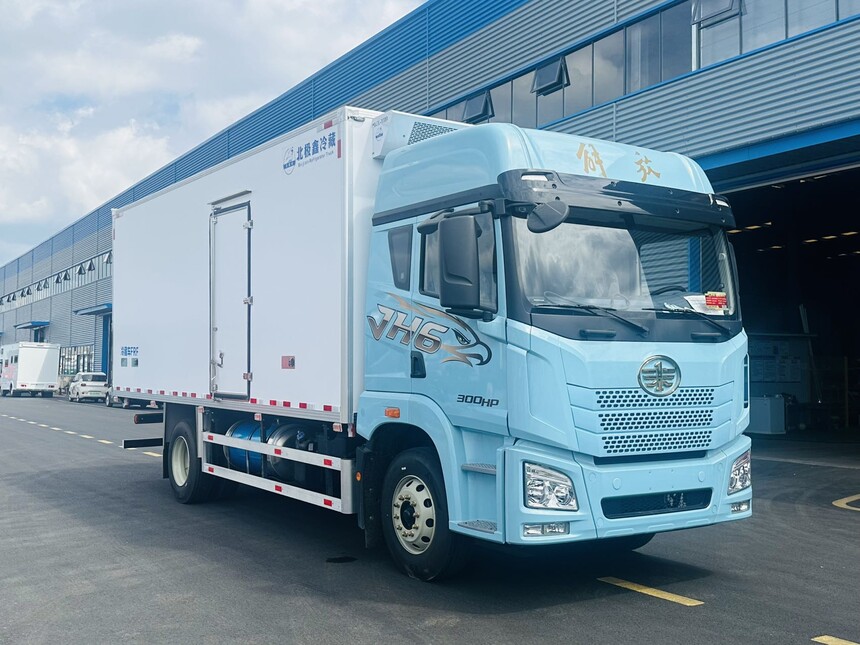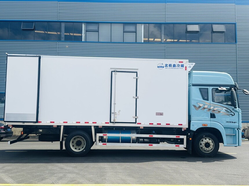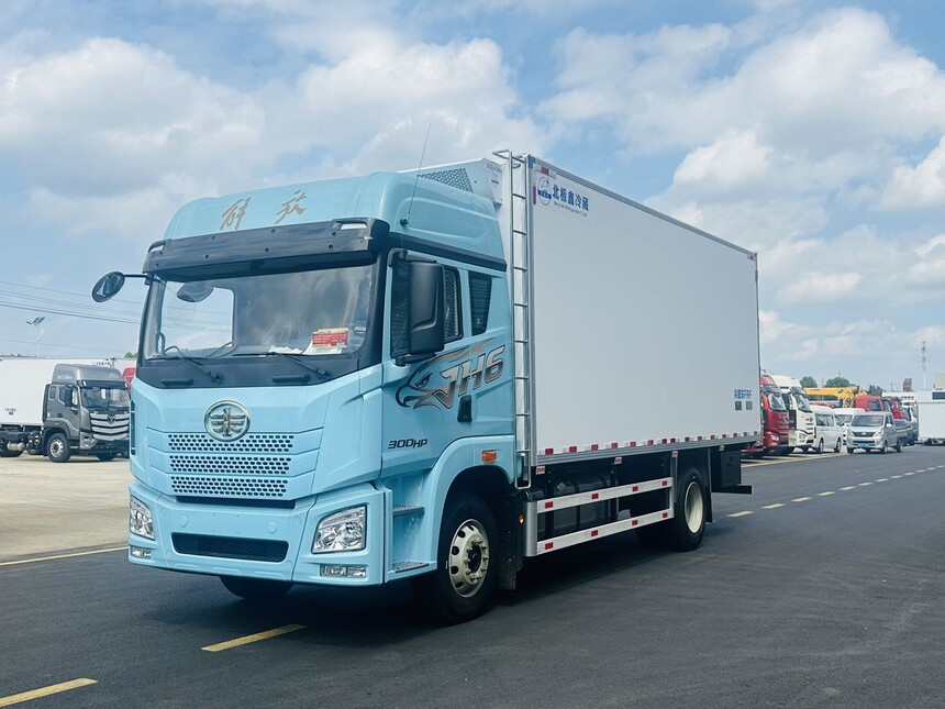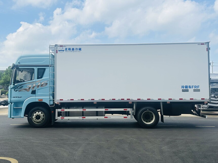 解放JH6玉柴300马力冷藏车 北极鑫冷藏车专业厂 CA5180XLCP26K2L2E6A80 整车尺寸:9200×2600×3995 箱体尺寸:6800×2430×2550 JH6低地板高顶驾驶室(四点空气易置/空调/电动举升)电动门商/电动电加热后视镜)发动机厂家及型号玉柴YCS06300-61A功率300P,离合器大扭矩更395变速箱陕齿10JSX110B-C,后桥378铸造桥速比3.9/加宽蹄片/鼓式制动)后桥速比3.91轴距5000,车架237*75*6.5轮胎275/80R22.5-18PR,ZX,视频包2.0(10寸屏+四方位影像)内外饰色彩优化,彩色液晶夜表,视频记录仪,疲劳监测,真皮多功能方尚盘,安道拓通风座椅,自动大灯控制,600L铝油箱,圆简后处理器,150Ah蓄电池,长保养粗滤,机箱桥长换油,10/10/10万公里,限速89KM/H,ABS